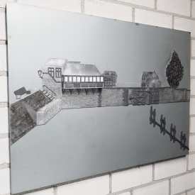 Het was de aanleiding om dit kunstwerk te gaan maken. Een schilderij 60x80cm in lood en zink van de Lingesluis met Merwezicht. De donkere gedeelten van de afbeelding bestaat uit lood en het lichtere gedeelte zink.